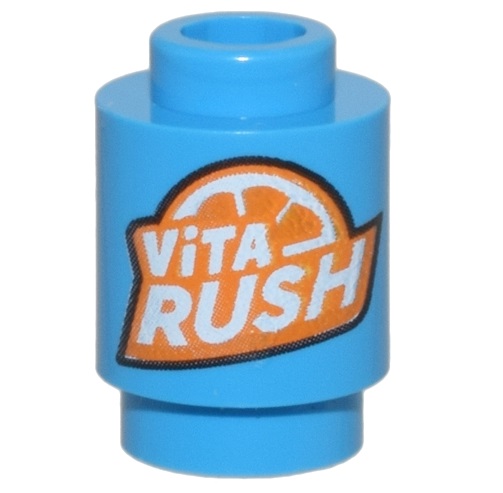 Cette brique ronde décorée 1 x 1 est au motif « Vita Rush » pour représenter une cannette de soda, de jus de fruit ou encore de boisson énergétique.