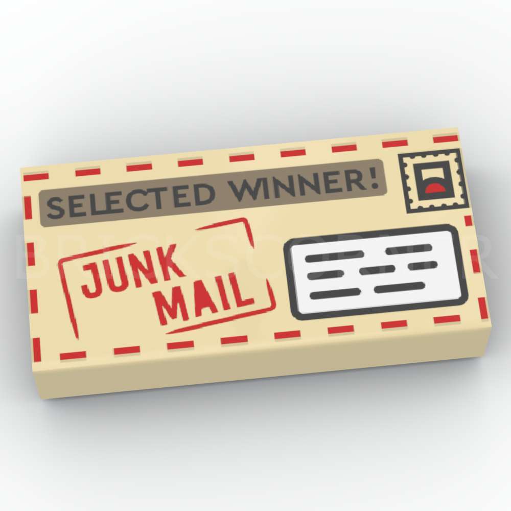 Cette jolie tuile décorée 1 x 2 représente une enveloppe / une lettre avec adresse et timbre et avec les mentions « courrier indésirable » (junk mail) et « gagnant choisi » (selected winner).