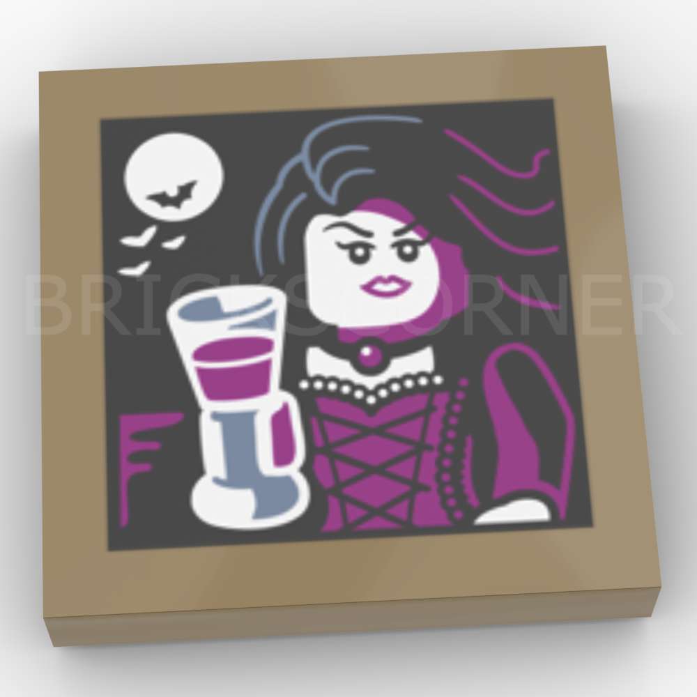 | Dénomination Element LEGO® | Tile 2 x 2 with Portrait of Vampire Minifigure with Magenta Dress Holding Goblet White Moon and Bats on Black Background Pattern |