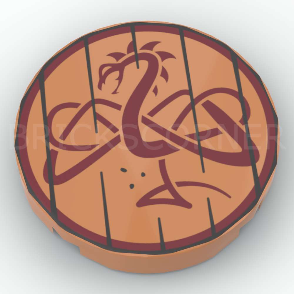 Cette jolie tuile ronde décorée 2 x 2 issue du set ref. 21343 « Viking Village » de 2023 représente un emblème ou un bouclier viking est au motif de dragon dessiné sur assemblage de planches.
